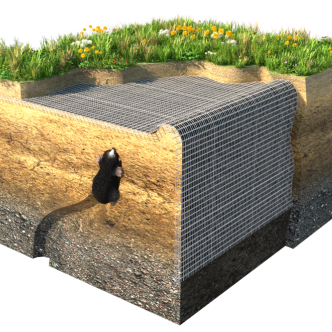 Molshopen zijn vaak een doorn in het oog en zorgen voor veel schade aan gazons. Om deze molshopen op een diervriendelijke manier tegen te gaan, kan RootBarrier® mollenwering horizontaal én verticaal ingezet worden. De mollenwering wordt horizontaal maximaal 5 cm en verticaal 50 cm tot 1 m onder het grasveld geplaatst.